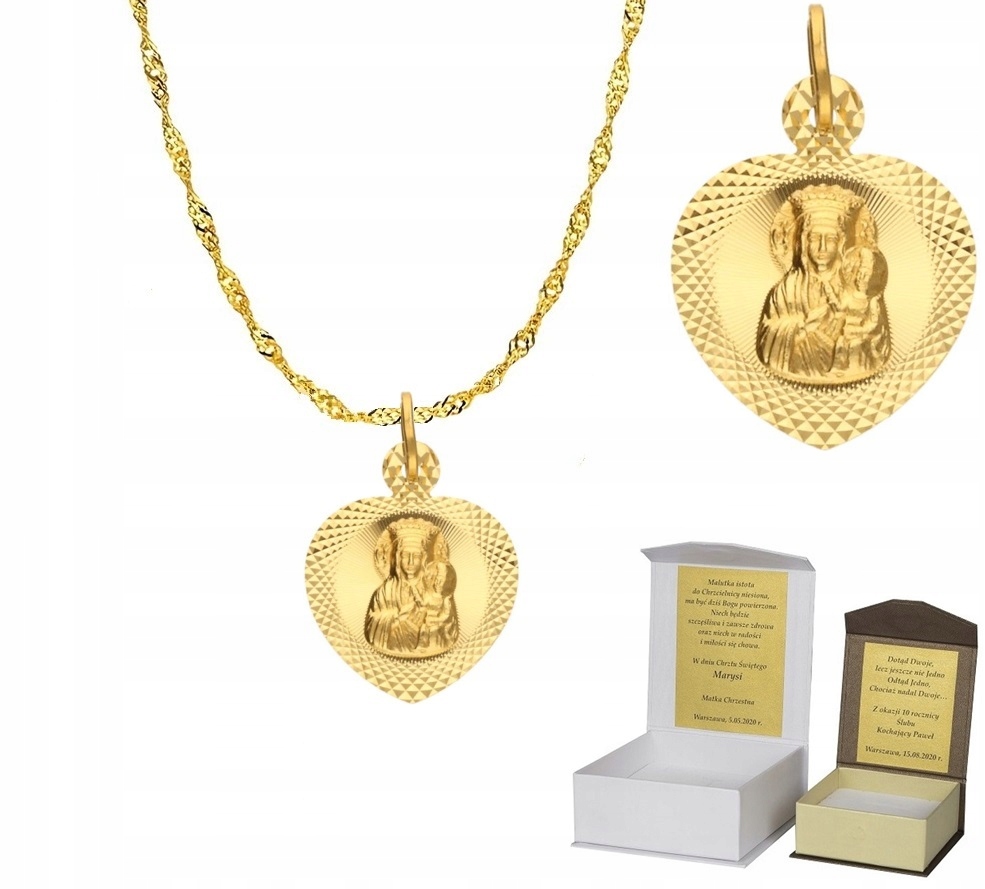 Złoty łańcuszek pr. 585 medalik MATKA BOSKA SERCE 50 cm DEDYKACJA Chrzest Komunia SZ1MZ3