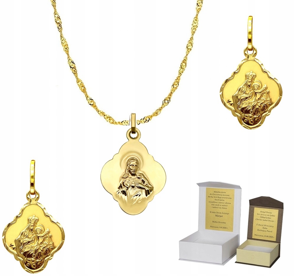 Złoty łańcuszek pr. 585 medalik SZKAPLERZ 50 cm DEDYKACJA Chrzest Komunia SZ1MZ4