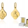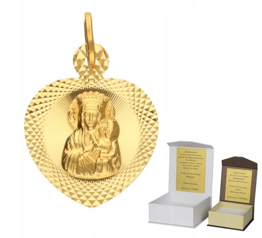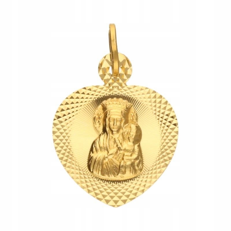 Przedmiotem sprzedaży jest złoty medalik – Matka Boska Częstochowska w diamentowanym sercuWybierając naszą ofertę masz całkowitą pewność, że kupujesz oryginalny wyrób jubilerski, wykonany z najwyższej jakości złota próby 585.Parametry produktu:1. Złoto, próba: 5852. Waga całkowita produktu: 0,89 g +/- 0,05 g3. Wymiary medalika bez krawatki: 14 mm x 14 mm